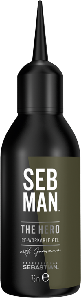 SEB MAN The Hero - Re-Workable Gel. Ein remodellierbares Gel, das ein unkompliziertes Styling ermöglicht und dem Haar einen mittleren Halt verleiht. Für einen bombenfesten Look, der jeder Herausforderung standhält. Mit Guarana-Extrakt und einem anregenden Duft von Bergamotte und rosa Pfeffer für eine lebendige Frische. Anwendung: Eine kleine Menge in den Handflächen verteilen und in das trockene Haar einarbeiten. Mit den Fingern in die gewünschte Form bringen.